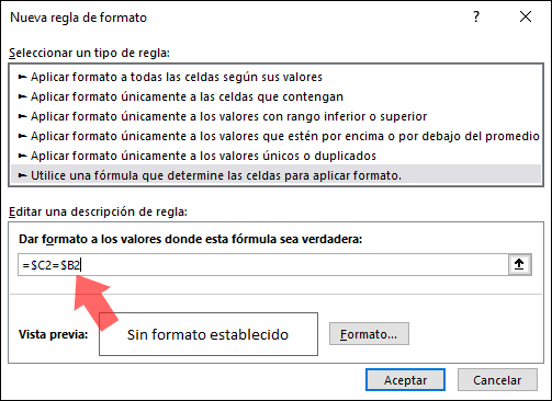 En la ventana desplegada seleccionamos la línea “Utilice una fórmula que determine las celdas para aplicar formato” y en el campo “Dar formato a los valores donde esta fórmula sea verdadera” ingresamos la siguiente fórmula: