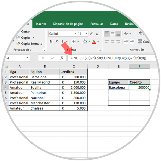 En este ejemplo, deseamos obtener el crédito otorgado en base al nombre que ingresemos en la celda E4, y allí usaremos el rango de datos B2:B8 para la consulta, la fórmula a usar será la siguiente: