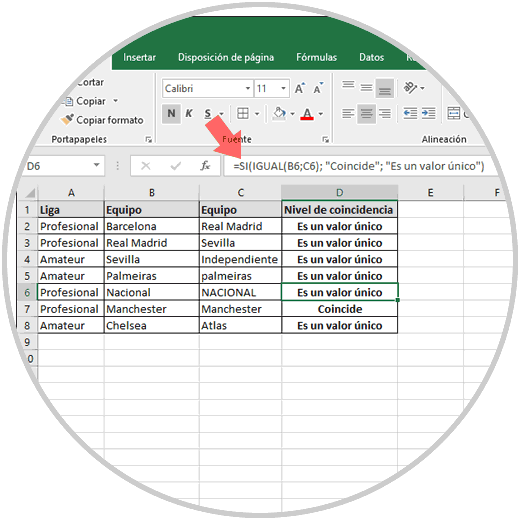 =SI(IGUAL(B2;C2); "Coincide"; "Es un valor único")