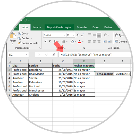 Allí, hemos establecido la celda base (F3) como un valor absoluto de modo que al comparar la columna C con dicha celda veremos que si la fecha es menor o igual será desplegado el mensaje “No es mayor” pero si la fecha es mayor veremos “Es mayor”: