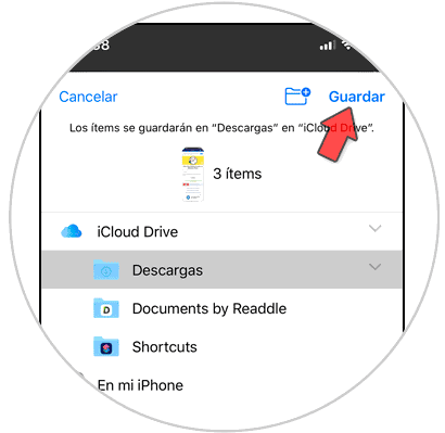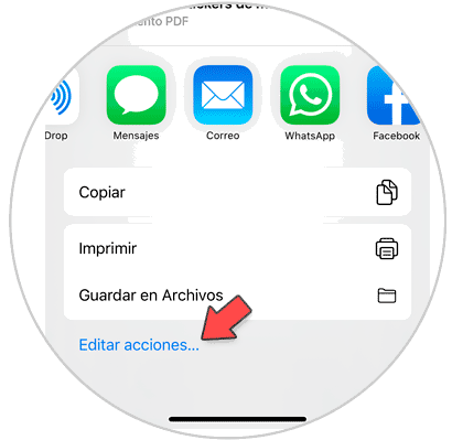 Aquí nos va a dar de compartir el PDF utilizando varios medios como Corre, WhatsApp, AirDrop, Skype, etc… Más abajo te da la opción de guardar el PDF en el dispositivo pulsando en “Guardar en archivos”.