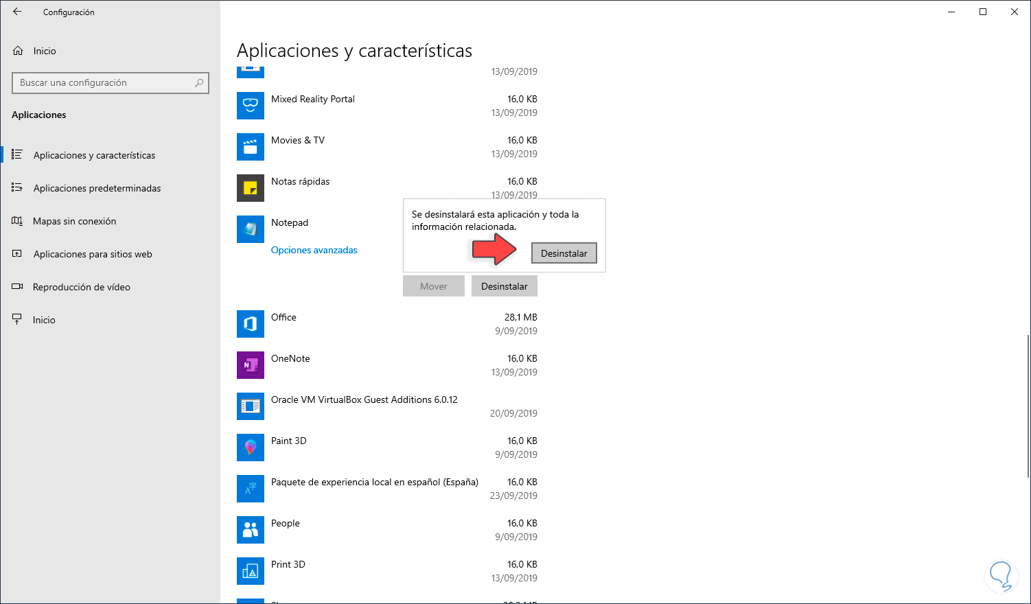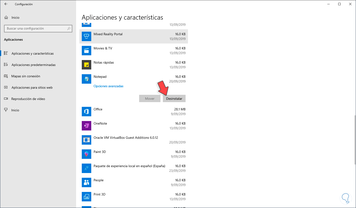 Allí vamos a la categoría “Aplicaciones” y luego iremos a “Aplicaciones y características” y allí ubicaremos la línea “Notepad”, damos clic sobre ella y se activará el botón “Desinstalar”: