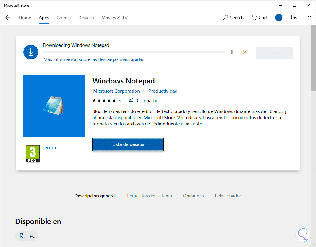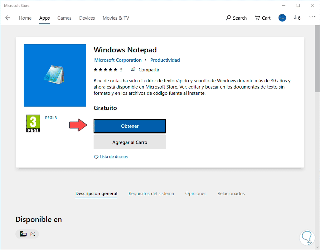 Ahora para instalar de nuevo Notepad en Windows 10 debemos ir al siguiente enlace: