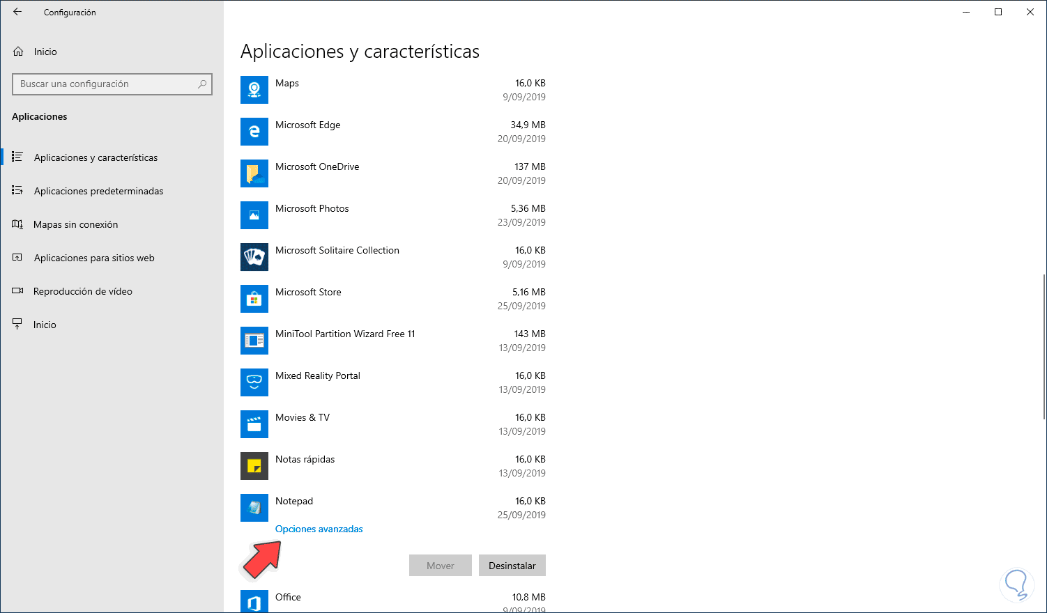 Para validarlo vamos de nuevo a Configuración - Aplicaciones - Aplicaciones y características y al dar clic sobre Notepad se activará la línea “Opciones avanzadas”: