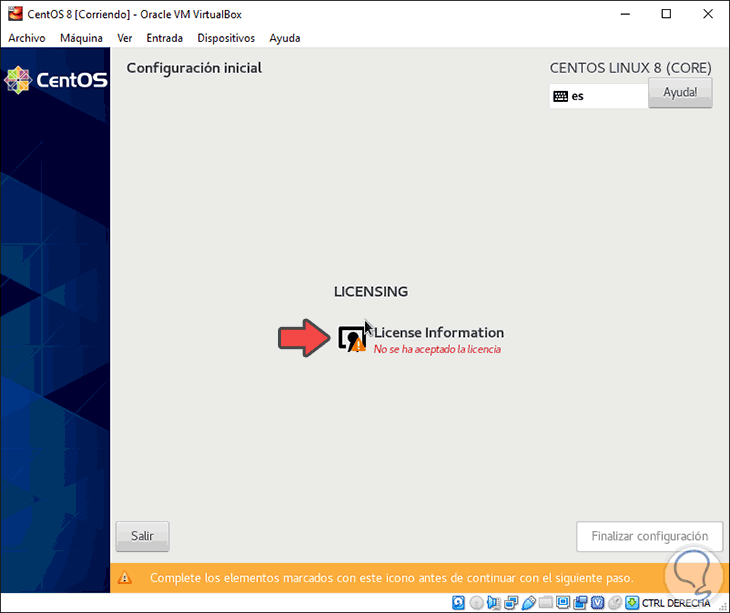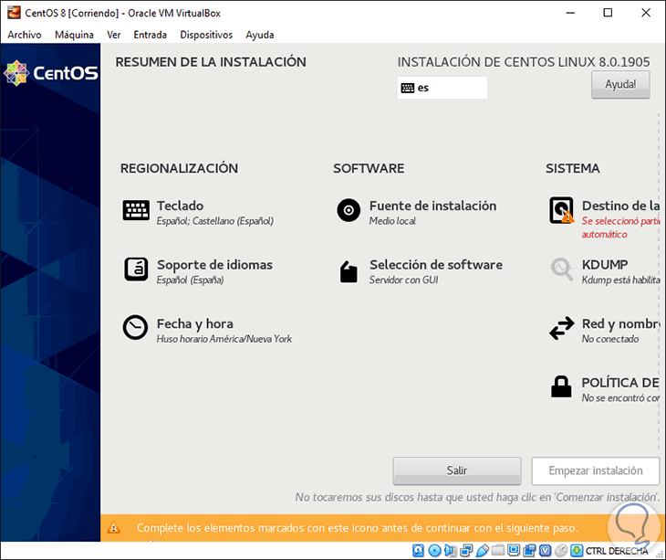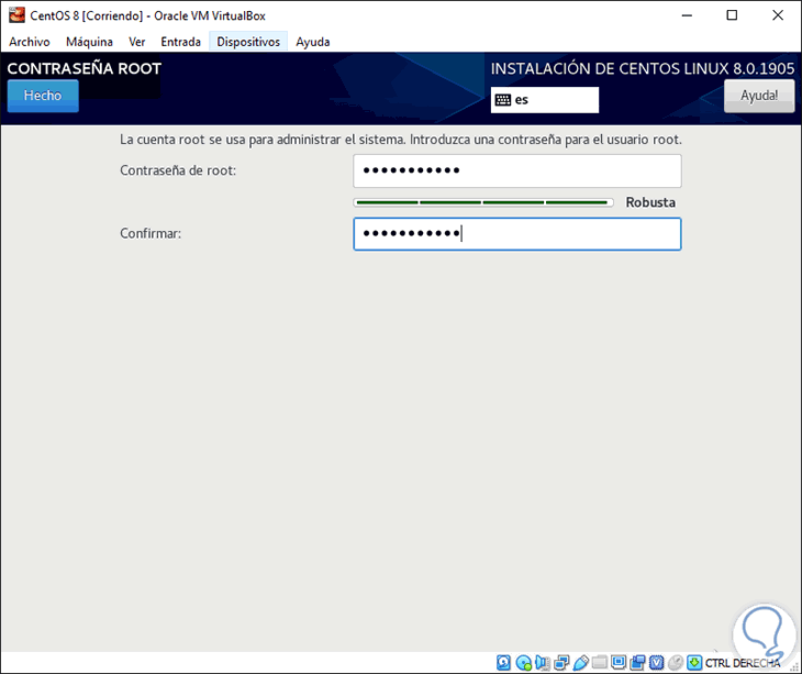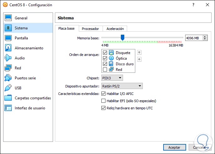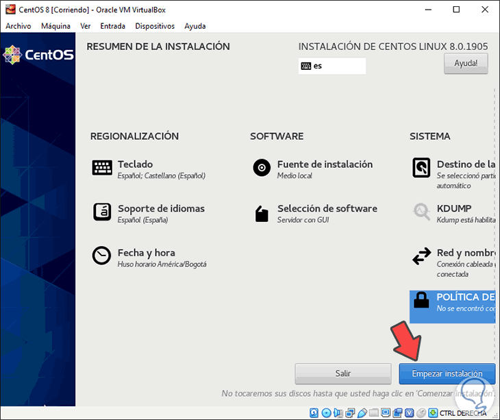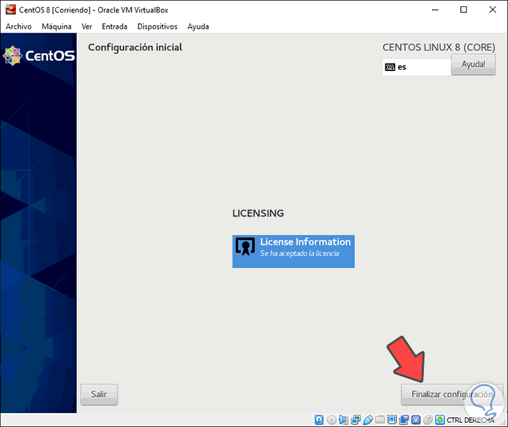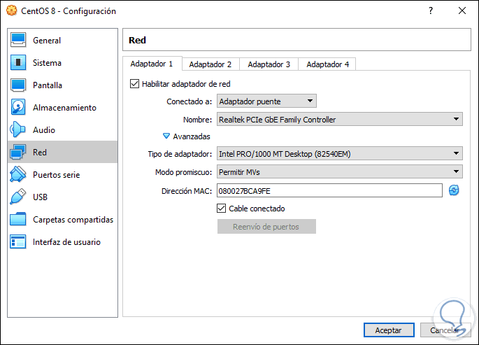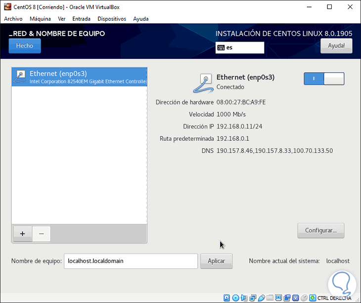 Con esto configurado podemos pulsar en Aceptar para proceder con la configuración de CentOS 8.