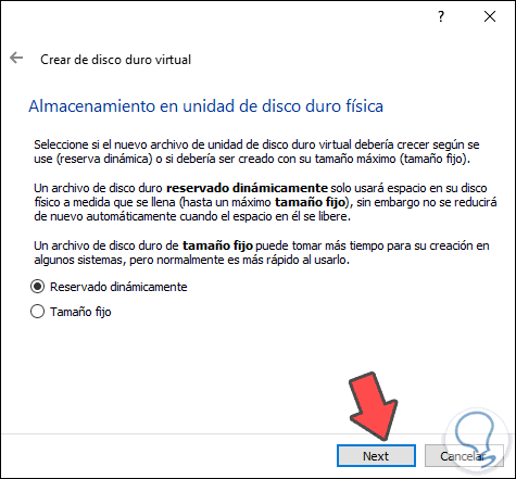 Una vez seleccionado, en la próxima ventana definiremos el tipo de almacenamiento. Allí podemos usar el espacio dinámico el cual crecerá a medida que ingresamos información en el disco o bien usar el tamaño fijo el cual quedará limitado al tamaño establecido: