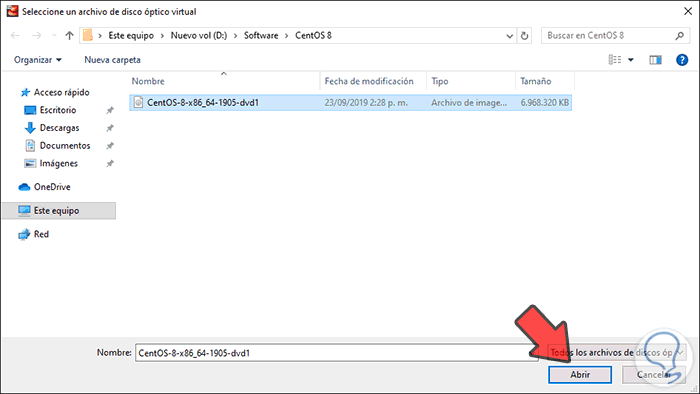 Damos clic en Abrir y se integrará la imagen ISO en VirtualBox: