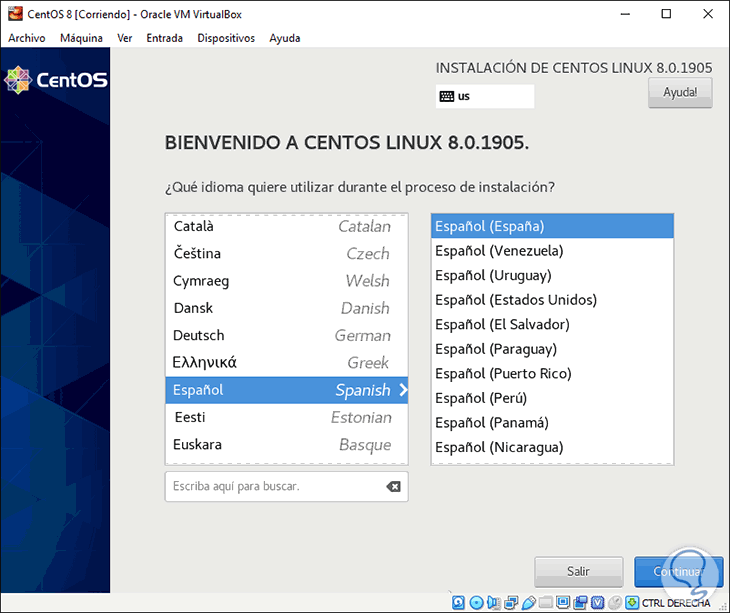 Seleccionamos la primera línea y vamos a seleccionar el idioma de instalación de CentOS 8: