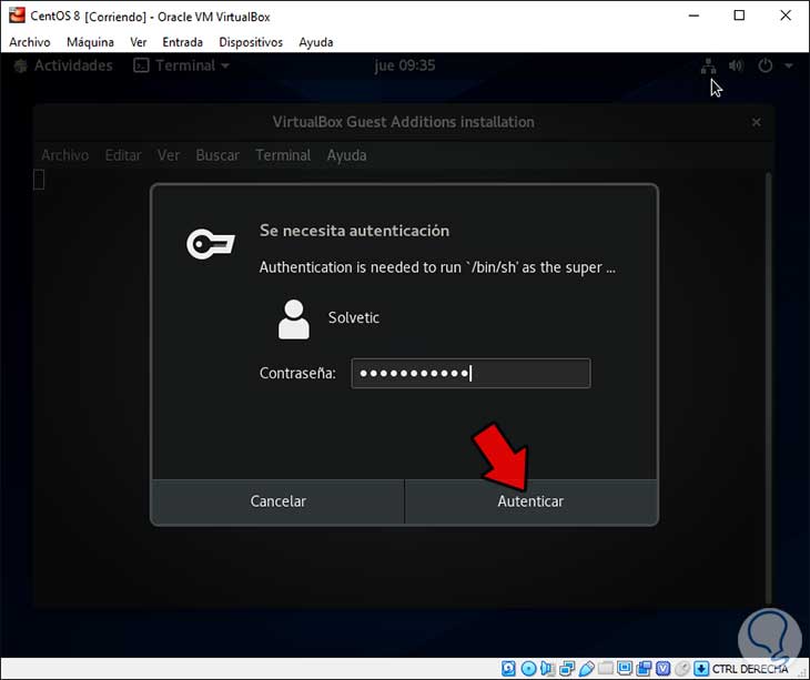 Ingresamos la contraseña y damos clic en Autenticar y se dará inicio al proceso de instalación de las Guest Additions en CentOS 8: