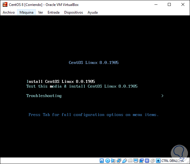 - “Install CentOS Linux 8.0.1905”: esta opción nos permite ejecutar la instalación del sistema inmediatamente.
