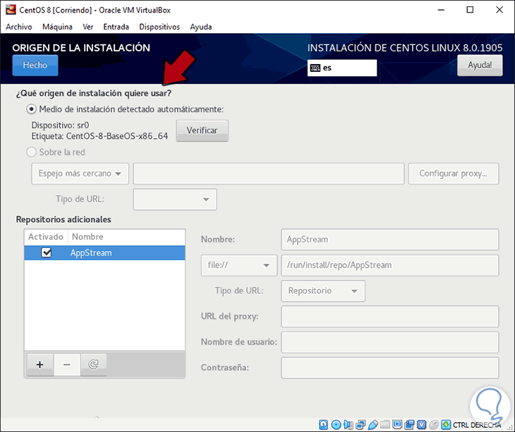 En Fuente de instalación encontramos la imagen ISO de CentOS 8 que será el origen de la instalación: