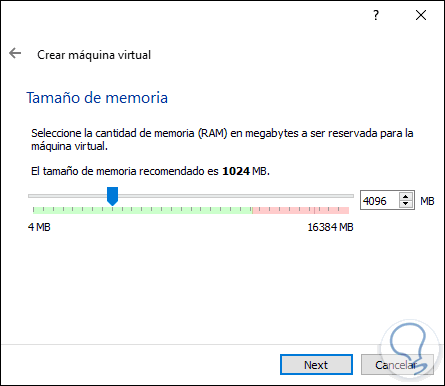 Damos clic en Next y ahora asignaremos la cantidad de memoria RAM deseada: