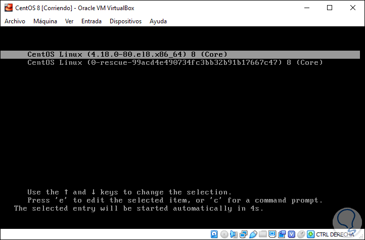 Retirar la unidad virtual con la imagen ISO y accederemos al GRUB de CentOS 8:
