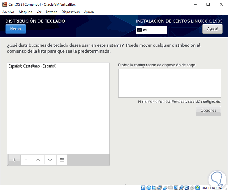 En la sección Teclado podemos definir un nuevo teclado para CentOS 8: