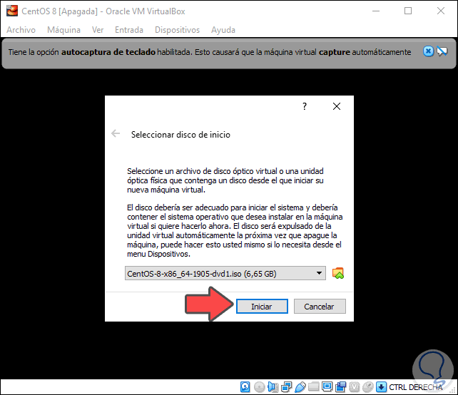 Damos clic en Iniciar para proceder con el arranque de CentOS 8