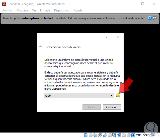 Para dar paso a este proceso, damos clic en el botón Iniciar y se desplegará lo siguiente. Allí debemos dar clic en el ícono de carpeta e ir a la ruta donde esta la imagen ISO de CentOS 8 la cual podemos descargar en el siguiente enlace: