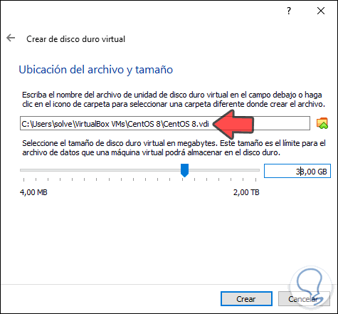 Definido esto damos clic en Next y es momento de asignar la ruta del disco duro virtual, así como su tamaño: