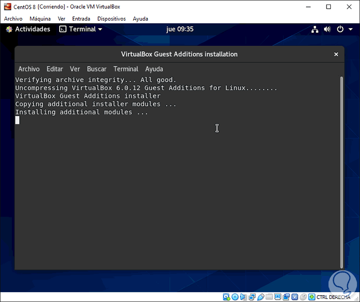 Allí pulsamos Enter para retornar al sistema y de este modo se han instalado las Guest Additions en CentOS 8.