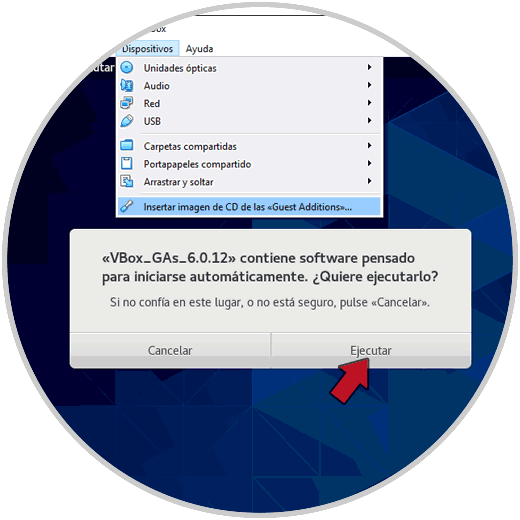 Para instalar estas Guest Additions, iremos al menú Dispositivos y allí seleccionamos la línea “Instalar imagen de CD de las <<Guest Additions>>: