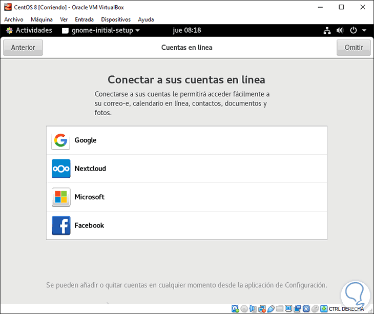 Al ser la primera vez de acceso a CentOS 8 y se desplegará el siguiente asistente. Damos clic en Siguiente y podemos asignar más idiomas de escritura. En la siguiente ventana podremos activar los servicios de ubicación. A continuación, se ofrece la posibilidad de conectar cuentas en línea: