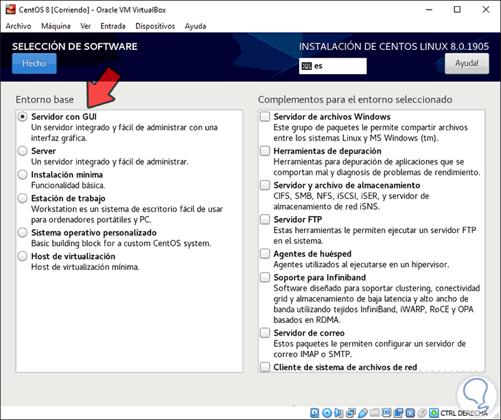 Pero es posible asignar un servidor únicamente en modo terminal, establecerlo como un host de virtualización, como estación de trabajo, etc. En el panel derecho será posible marcar las funciones deseadas para CentOS 8.