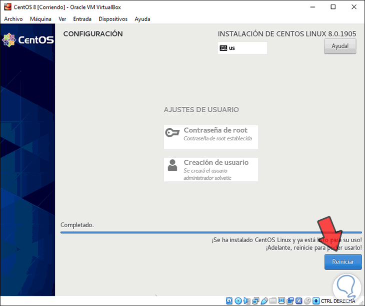 Cuando el proceso de instalación finalice veremos el siguiente mensaje. Allí debemos dar clic en Reiniciar