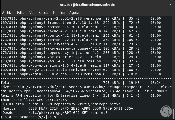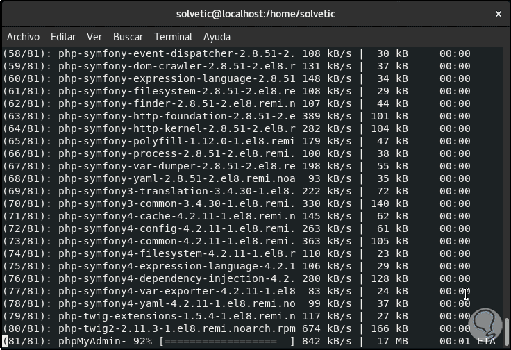 Después de habilitar el repositorio Remi en CentOS 8, vamos a instalar phpMyAdmin a través del administrador de paquetes yum, así todas las dependencias se instalarán de forma automática, ejecutemos lo siguiente: