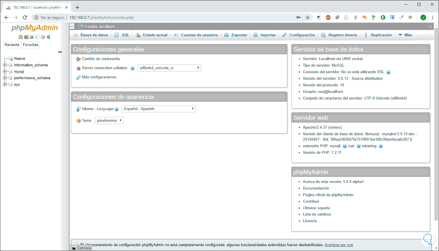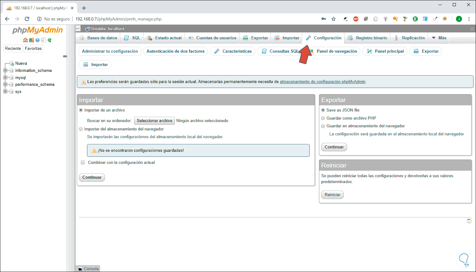 - En la pestaña Configuración es posible ajustar conceptos de phpMyAdmin: