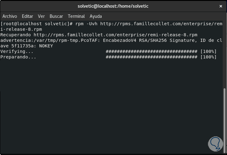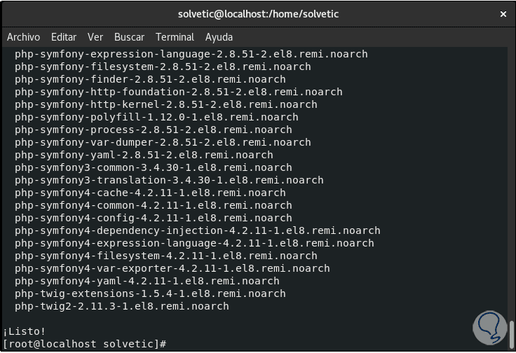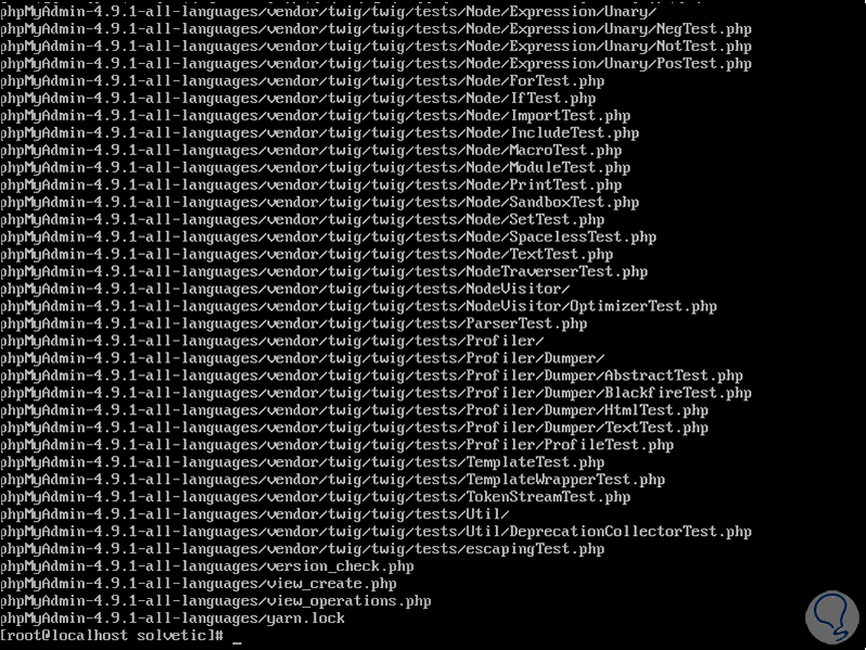 En este punto estaremos listos para acceder a phpMyAdmin pero Solvetic te explicará algo importante, con este proceso (el cual puede ser complejo), el repositorio para CentOS 8 no incluye la instalación simple con el comando “yum install phpadmin” la cual simplifica enormemente el proceso, esto no significa que no sea posible y es por ello que antes de ver el entorno de phpMyAdmin te explicaremos ese otro método y tú decides la forma adecuada para instalar phpMyAdmin en CentOS 8.