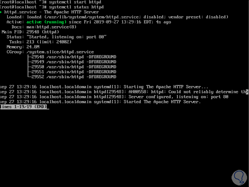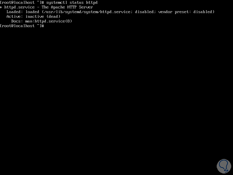 Vamos a comprobar el estado del servidor web en CentOS 8 ejecutando: