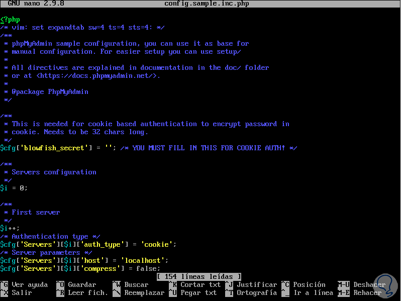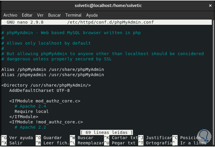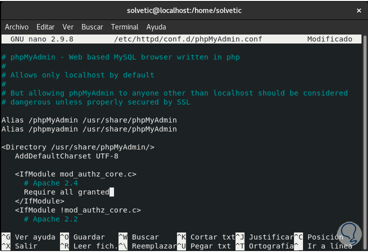 Es momento de configurar phpMyAdmin, en este punto phpMyAdmin por defecto solo puede ser accesible desde localhost, de modo que, si deseamos acceder de forma externa, será necesario editar el archivo de configuración de Apache de phpMyAdmin con el siguiente comando: