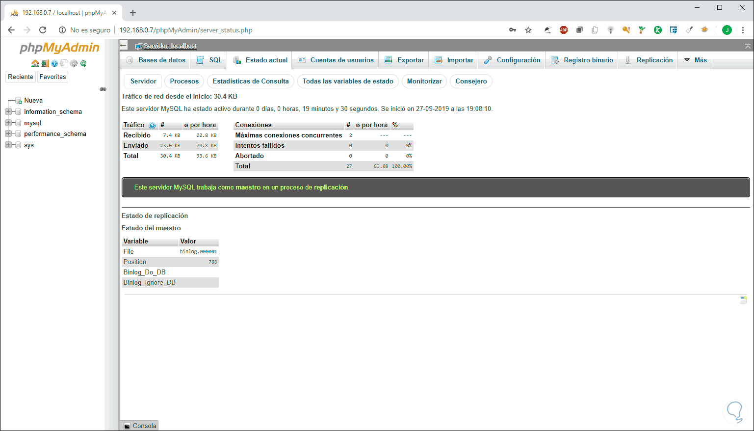 En la pestaña Estado actual podremos visualizar el tráfico actual, así como procesos, estadísticas de consulta y más: