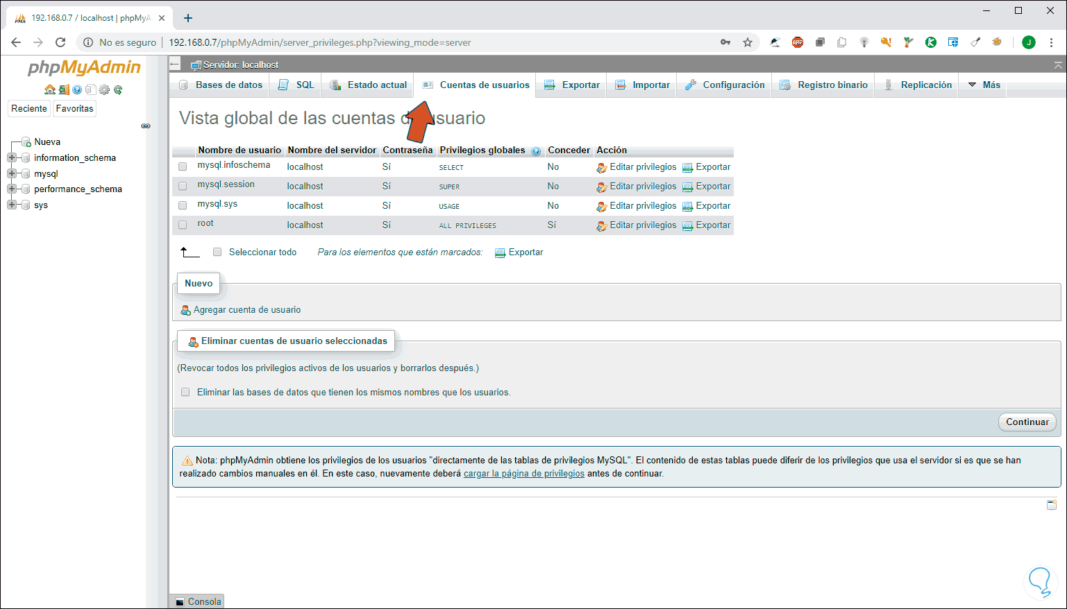 En cuentas de usuarios observaremos los usuarios registrados en la base de datos y podremos agregar nuevos usuarios, así como editar o eliminar los actuales: