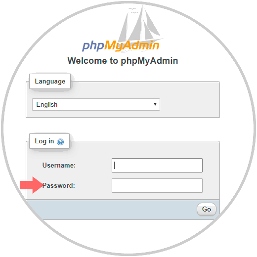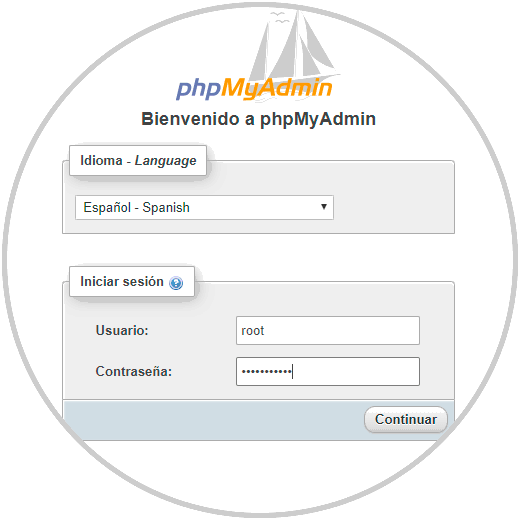 Allí podemos cambiar el idioma e iniciamos sesión con las credenciales del usuario MySQL: