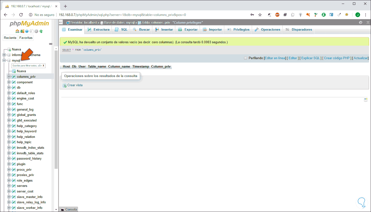 Pulsamos en Continuar y este será el entorno de phpMyAdmin: