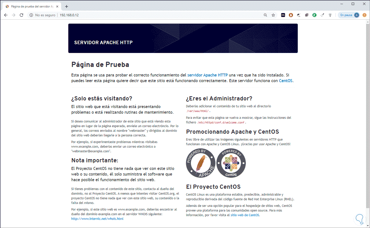 Para comprobar Apache vamos a un navegador e ingresamos la siguiente sintaxis: