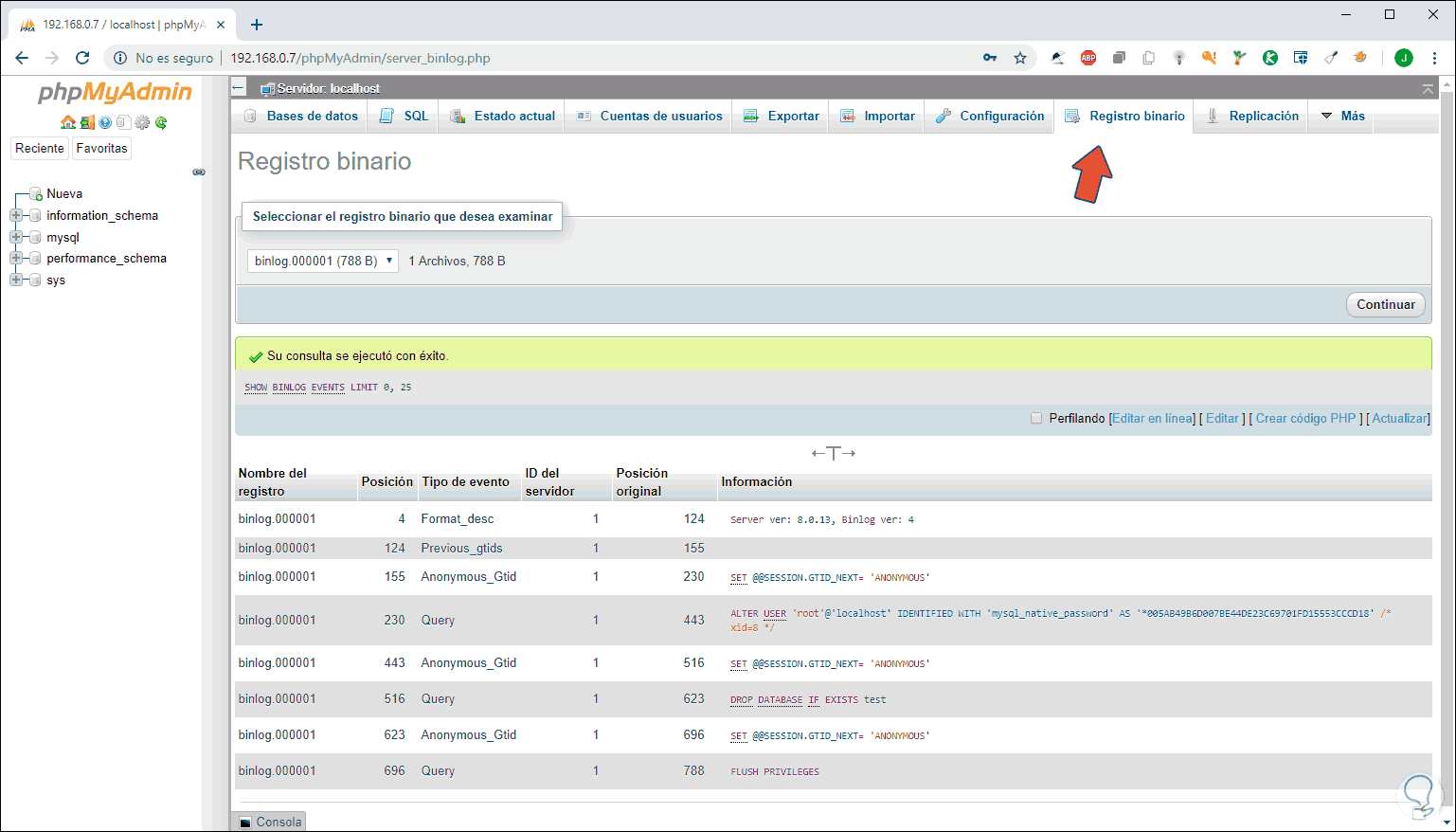 En la sección Registro binario accedemos a las consultas de los registros binarios creados: