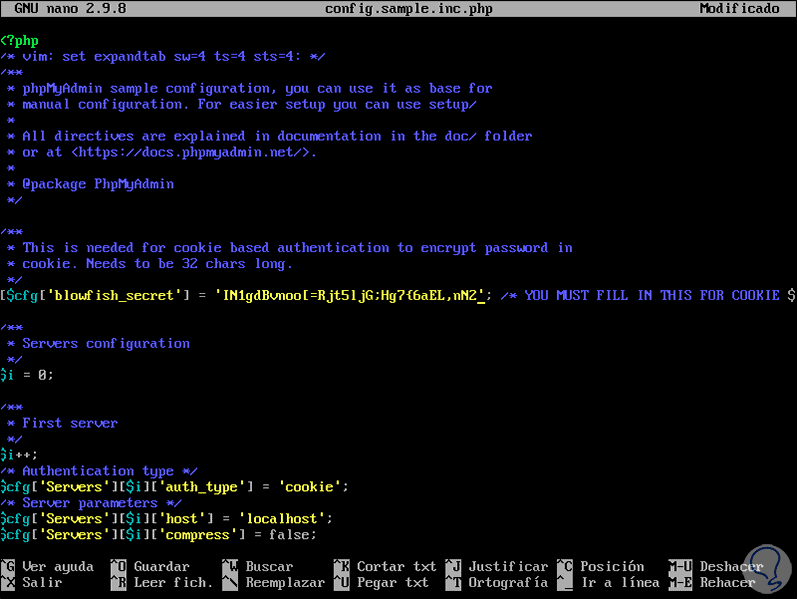 En la línea blowfish_secret generaremos una nueva clave secreta y esta puede ser creada desde el siguiente enlace:
