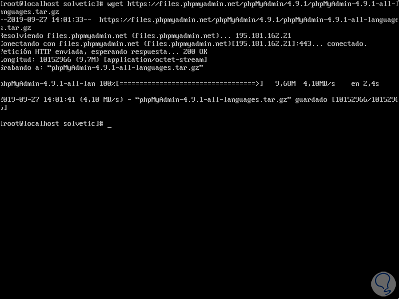 Finalmente estamos listos para instalar phpMyAdmin, para ello primero vamos a descargar la versión más reciente 4.9.1 ejecutando lo siguiente: