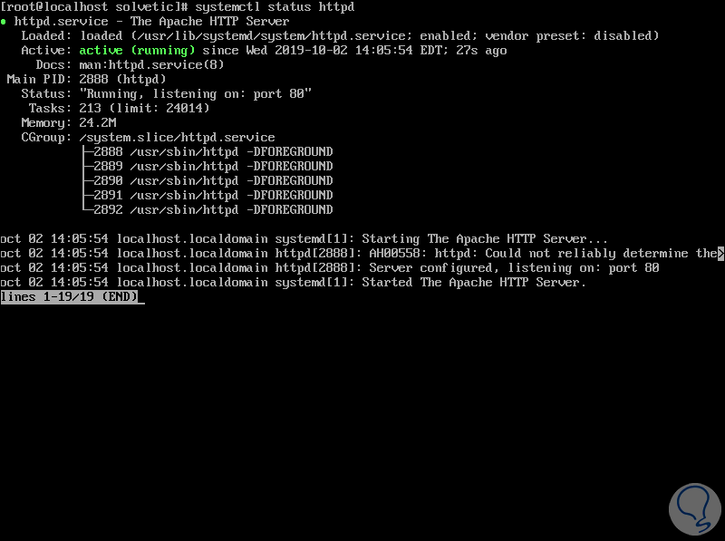 Una vez que Apache haya sido instalado en el sistema CentOS 8, vamos a iniciar el servicio y a habilitarlo en el arranque de CentOS 8, para ello usaremos las siguientes líneas: