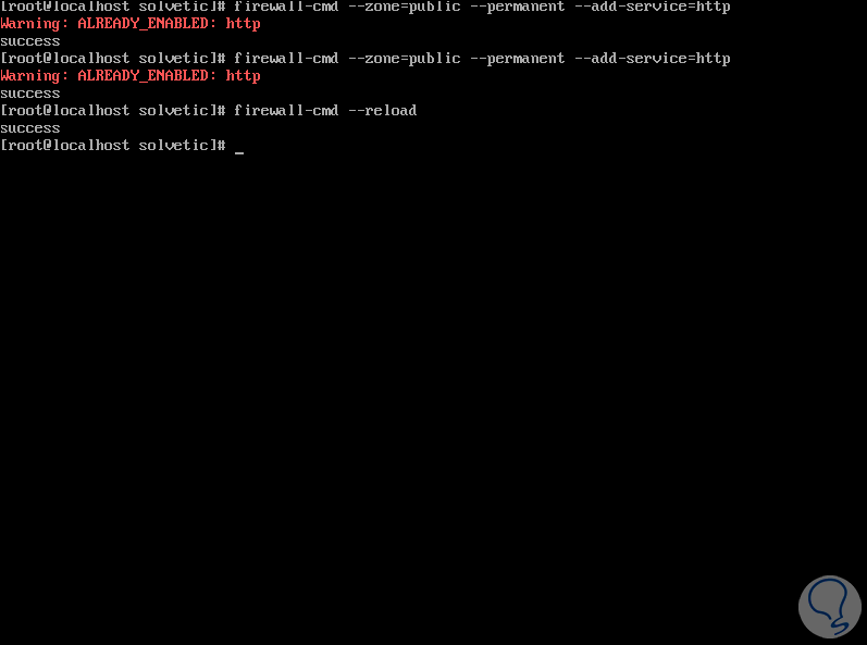 firewall-cmd --zone=public --permanent --add-service=http firewall-cmd --zone=public --permanent --add-service=https firewall-cmd –reload