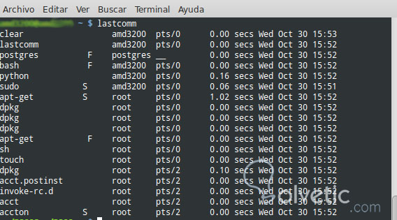 El comando lastcomm muestra los últimos comandos ejecutados por cualquier persona en el sistema. Este comando está disponible sólo si tiene procesos en ejecución. Para utilizarlo debemos instalar un pequeño programa a llamado acct que esta en los repositorios de cualquier distribución Linux.