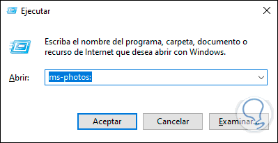 Luego, en la ventana desplegada ejecutamos “ms-photos:”. Damos clic en Aceptar o pulsamos Enter para acceder a Fotos.