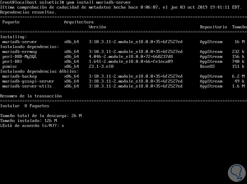 Ingresamos la letra “s” para confirmar la descarga e instalación de MariaDB: