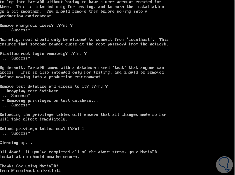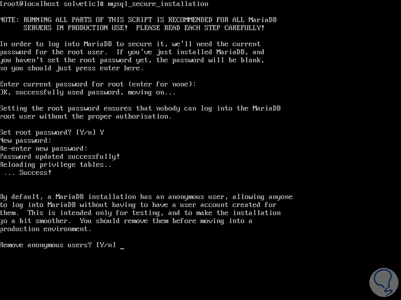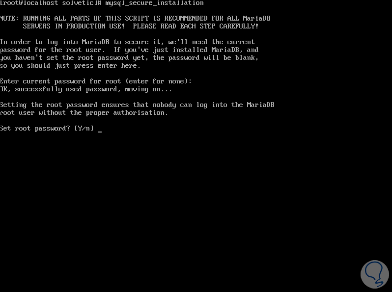 Ahora es momento de proteger el servidor de MariaDB en CentOS 8, para ello vamos a ejecutar lo siguiente: