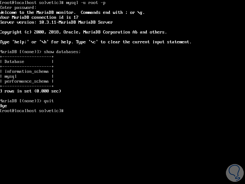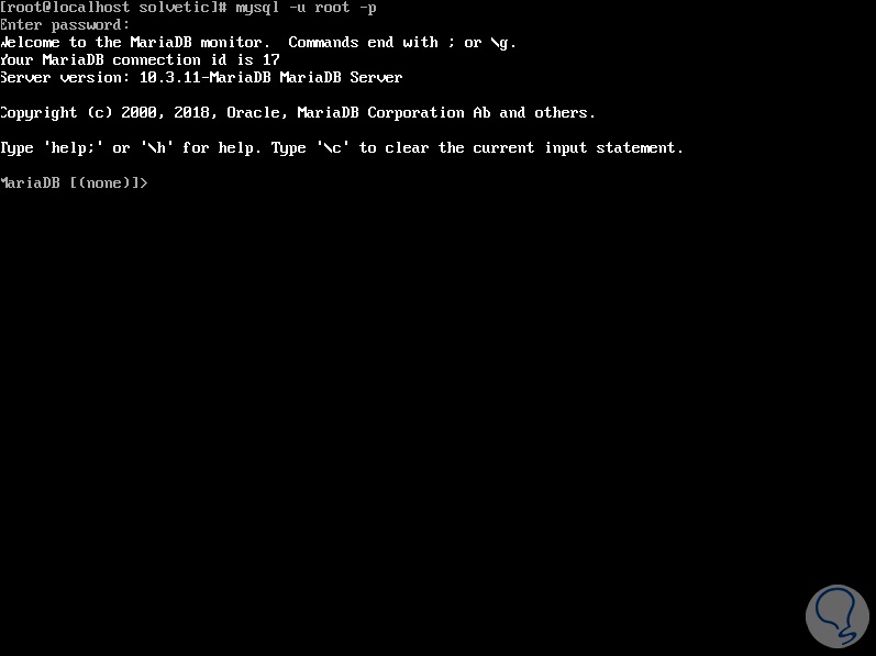 mysql -u solvetic -p solvetic1Luego ingresamos la contraseña.