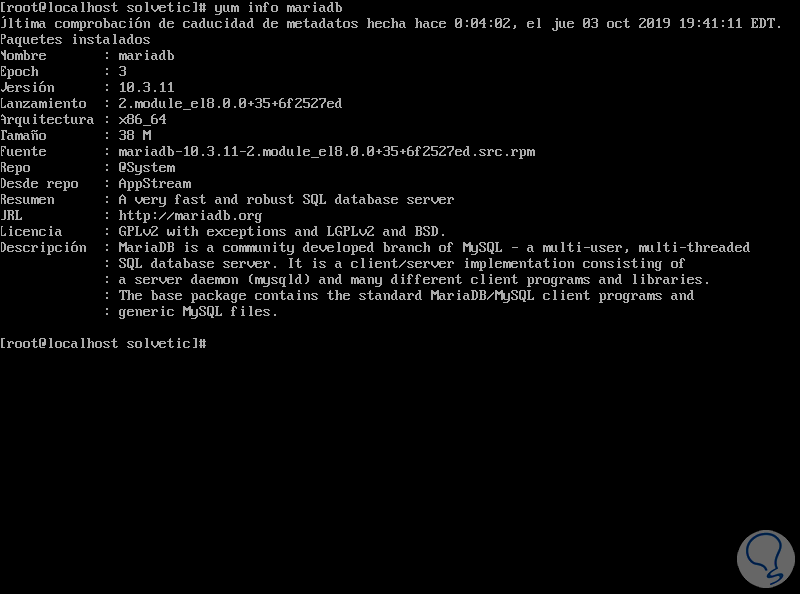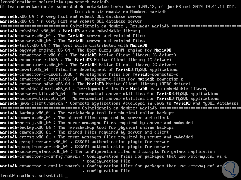 El primer paso a dar será consular los paquetes de MaríaDB en CentOS 8 ejecutando lo siguiente: