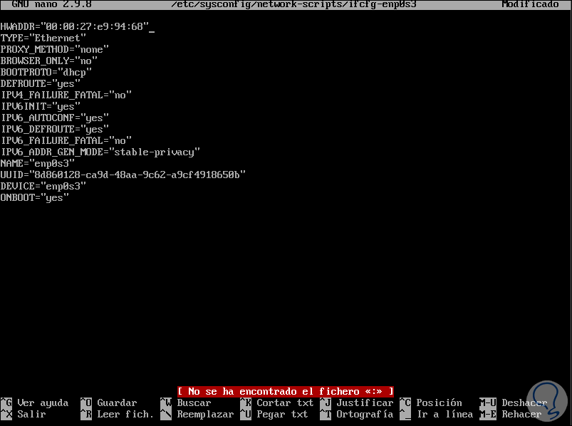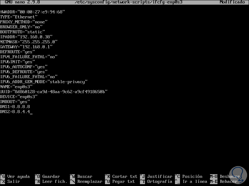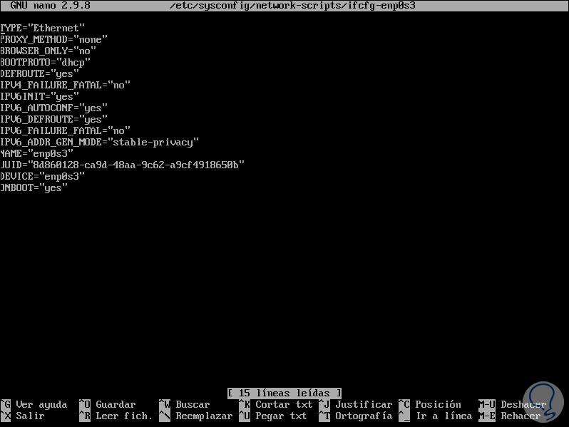 nano /etc/sysconfig/network-scripts/ifcfg-enp0s3Al acceder a este archivo encontramos todos los detalles de red como: