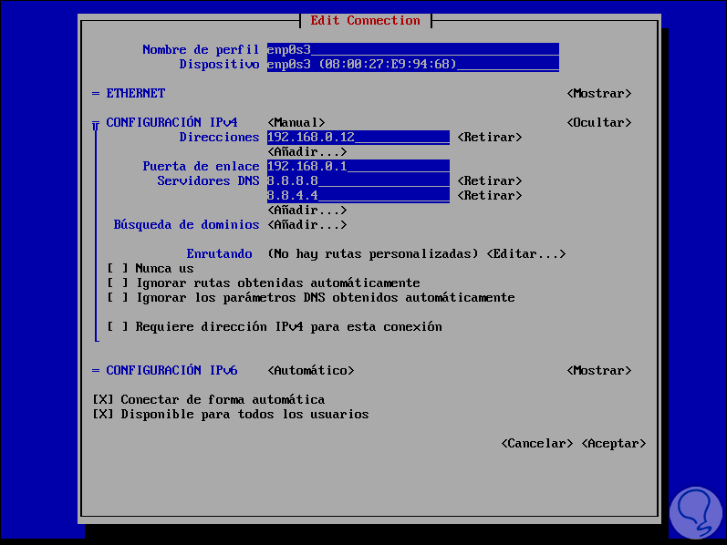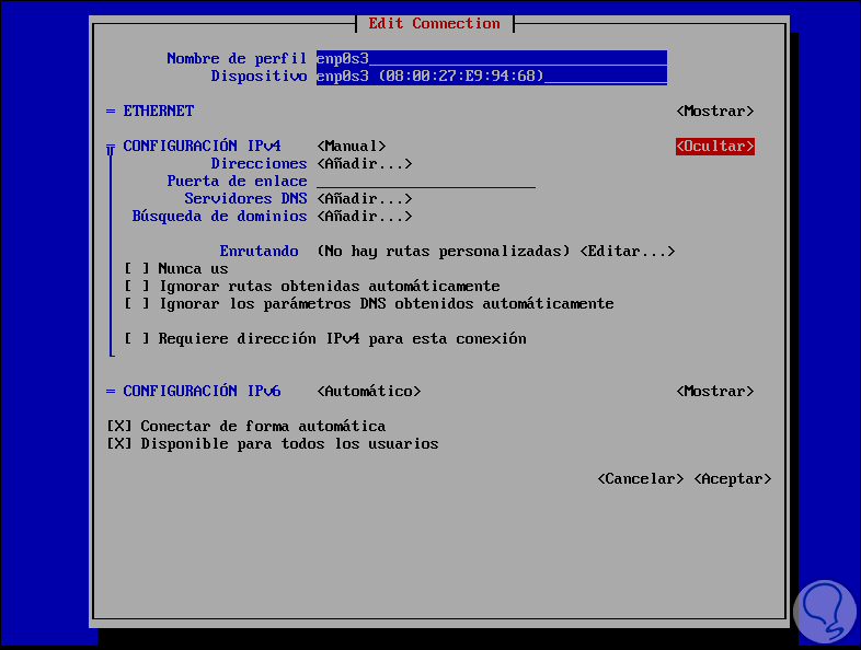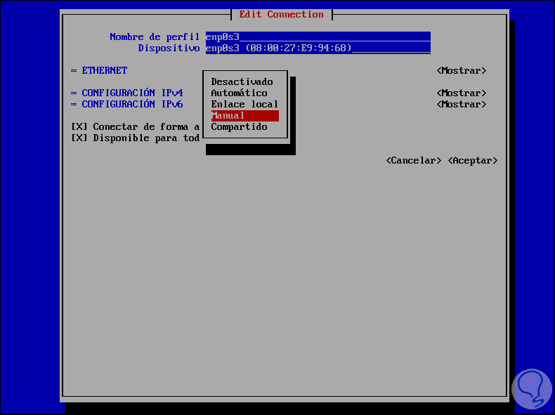 Allí por defecto podemos ver el ID del adaptador de redel cual esta configurado por DHCP (Automático), si quisiéramos establecer la IP de forma manual debemos usar la tecla Tabulador para seleccionar la línea “Configuración de IPv4 y allí pulsamos Enter para seleccionar la opción “Manual”:
