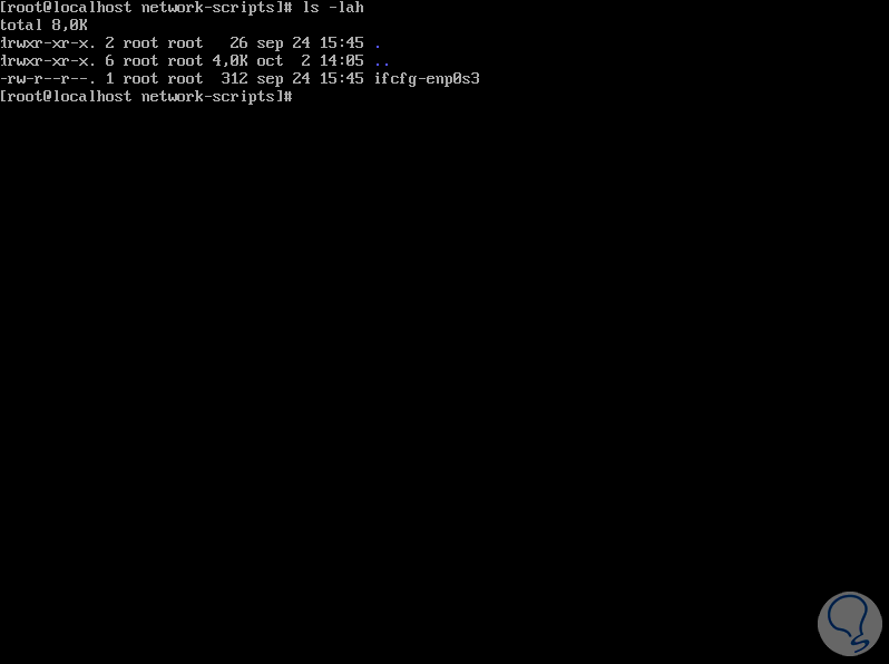 En este caso podemos ver que nuestro adaptador está identificado como “ifcfg-enp0s3”. En caso de contar con más adaptadores de red estos estarán identificados con la sintaxis ifcfg-ensxxx.